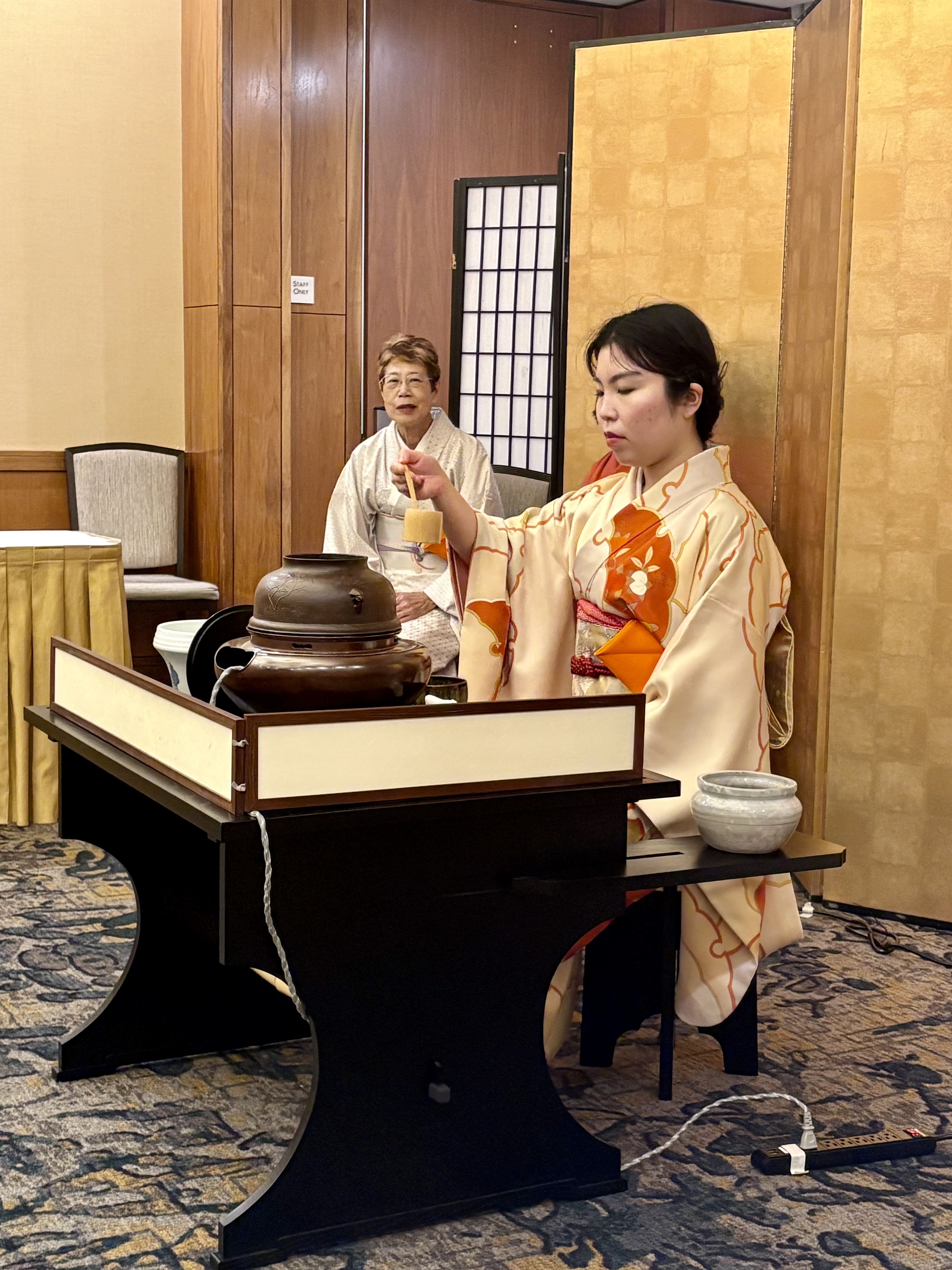 「初音」と名付けられた練切と、当代家元・猶有斎お好みの銘「楽寿の昔」の濃茶を頂戴し、参加者一同、悠久の時を超えて受け継がれてきた茶道の精神と日本文化の奥深さに、静かに心を寄せる得難いひとときを過ごしました。